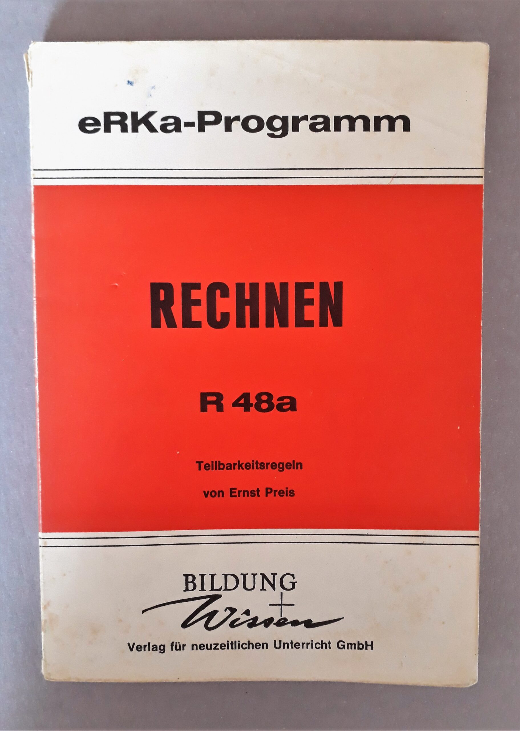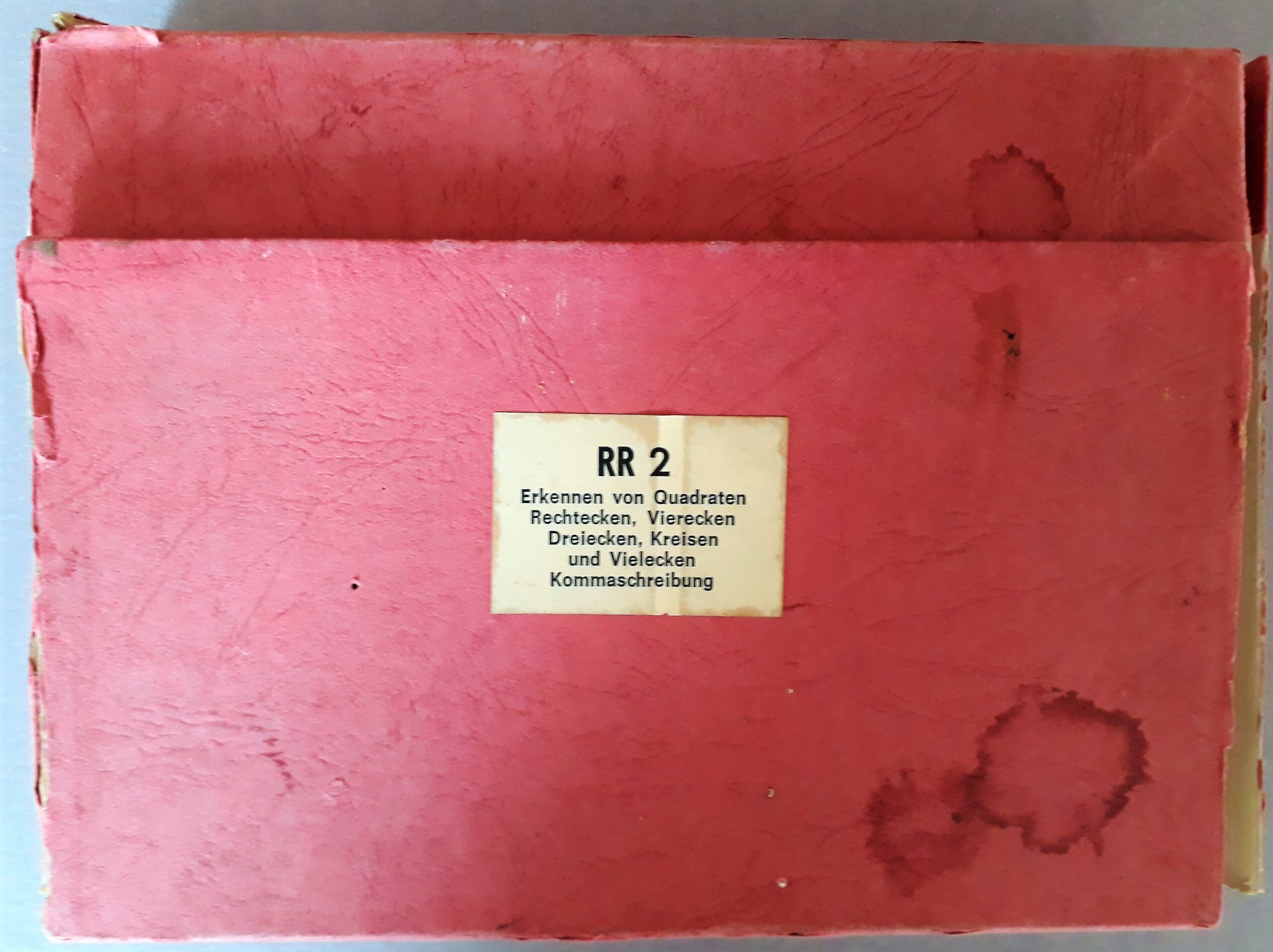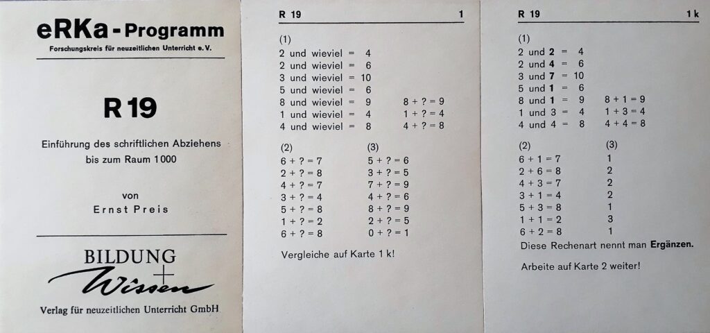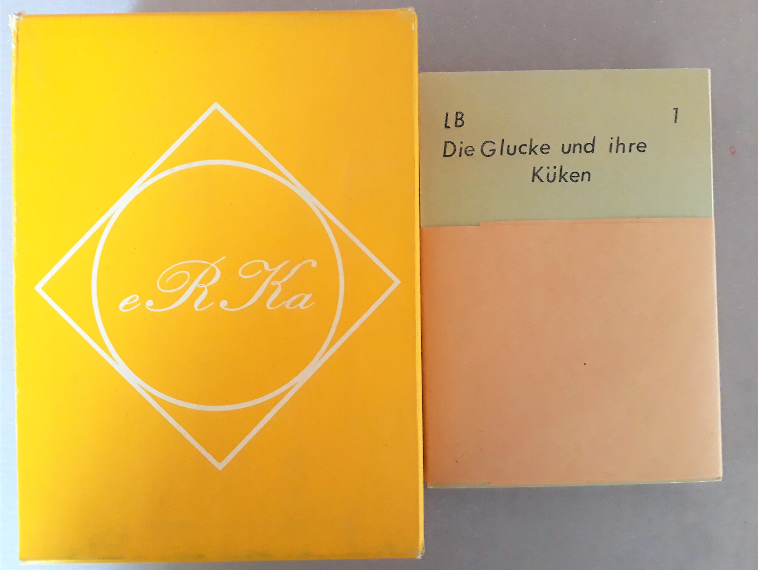 Eines der entwickelten Materialien ist das sogenannte eRKa-Programm, welches sich nun im Archiv befindet. Wie erwähnt stand bei den Materialien im Fokus, dass sie selbständig be- und erarbeitet werden konnten. Es bestand aus Kartensätzen und kleinen Pappschachteln zu verschiedenen Themen. Die aufeinander aufbauenden Lerninhalte, zunächst für die Bereiche Lesen und Rechnen, orientierten sich am Alter und Leistungsvermögen der Schüler*innen. Dem Selbstlernaspekt entsprechend verfügten die Lernsets Kontrollkarten, anhand derer die Richtigkeit der gefundenen Lösung ersichtlich wurde. Bei Schwierigkeiten mit einer Aufgabe halfen Mitschüler*innen oder Lehrer*innen. Aufgaben auf roten Karten wurden gelöst und die Lösungen der Lehrperson präsentiert. So hatten diese einen Überblick über den Lernentwicklungsstand und konnten ihre Schüler*innen gezielt unterstützen. Für die Lehrkräfte wurden themenspezifische Anleitungshefte entwickelt.