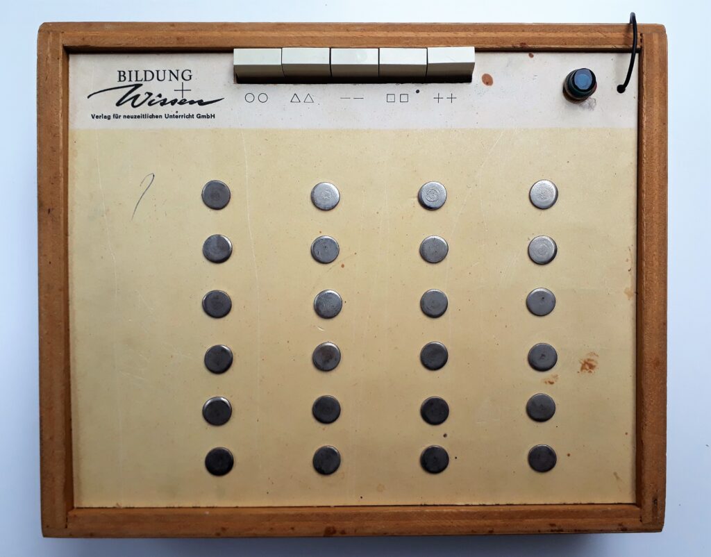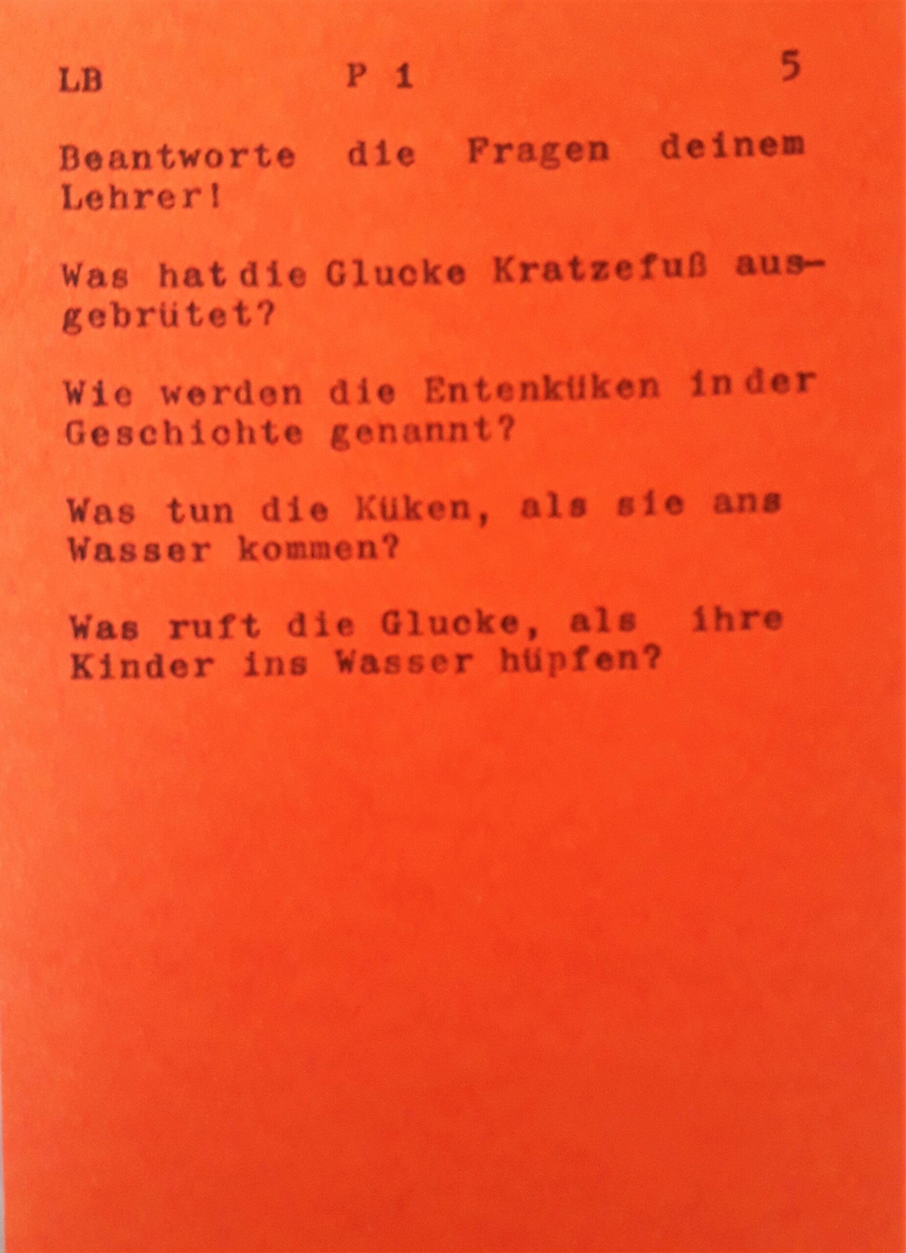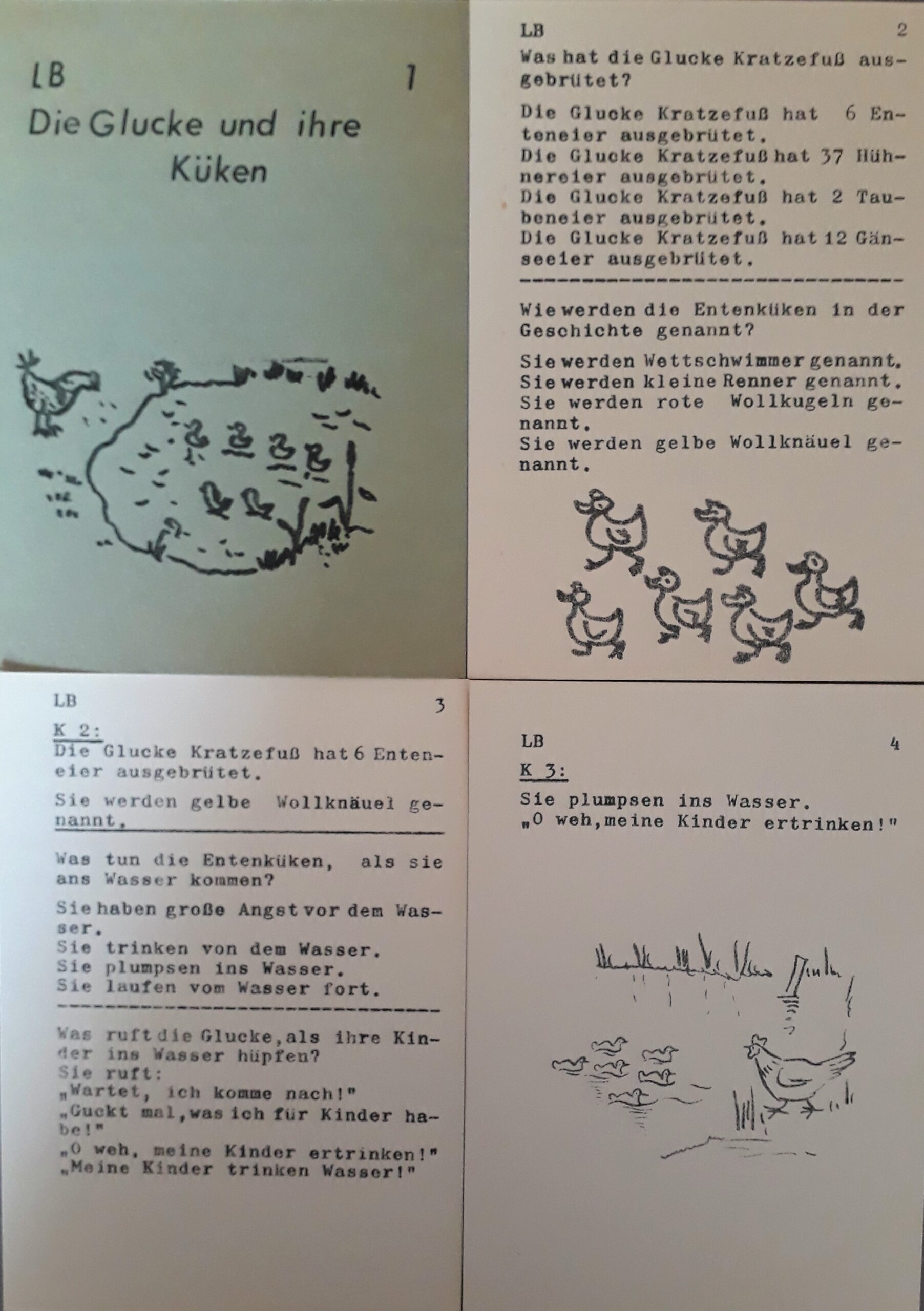 Eines der entwickelten Materialien ist das sogenannte eRKa-Programm, welches sich nun im Archiv befindet. Wie erwähnt stand bei den Materialien im Fokus, dass sie selbständig be- und erarbeitet werden konnten. Es bestand aus Kartensätzen und kleinen Pappschachteln zu verschiedenen Themen. Die aufeinander aufbauenden Lerninhalte, zunächst für die Bereiche Lesen und Rechnen, orientierten sich am Alter und Leistungsvermögen der Schüler*innen. Dem Selbstlernaspekt entsprechend verfügten die Lernsets Kontrollkarten, anhand derer die Richtigkeit der gefundenen Lösung ersichtlich wurde. Bei Schwierigkeiten mit einer Aufgabe halfen Mitschüler*innen oder Lehrer*innen. Aufgaben auf roten Karten wurden gelöst und die Lösungen der Lehrperson präsentiert. So hatten diese einen Überblick über den Lernentwicklungsstand und konnten ihre Schüler*innen gezielt unterstützen. Für die Lehrkräfte wurden themenspezifische Anleitungshefte entwickelt.